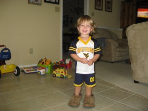 Colt shows off his West Virginia pride while wearing Daddy’s house slippers.