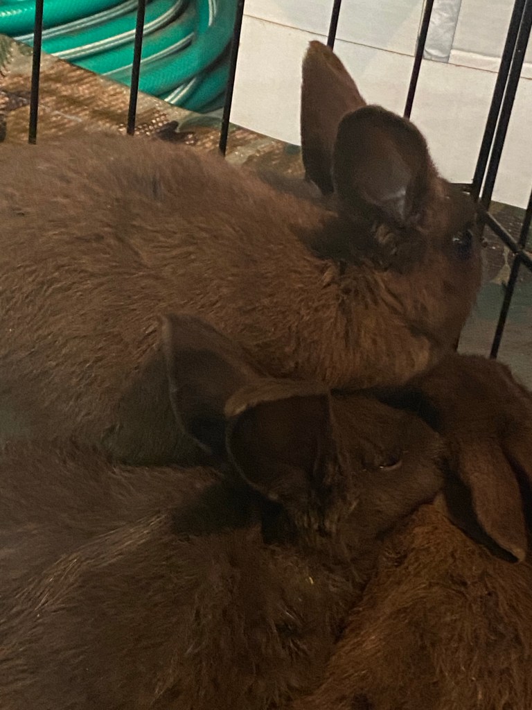 That evening we drove to the school to get the rabbit with 3 of the cages in the back of the truck because the last one wouldn’t fit and yes, I was worried about only having 3 cages. We walk in the school, with Em filming a video to post later on TikTok, and find our way to the room. We enter and look around and to our surprise, the other people in the room had ONE small cage or a box or an animal carrier. WHAT?!?! How could these rabbits fit in those? What were they thinking?